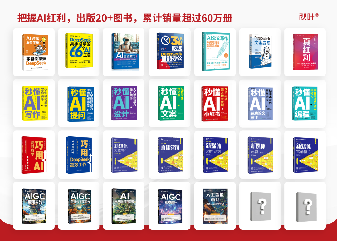 秋叶团队在职场教育领域深耕 12 年,全网粉丝超 3500 万。当多数人还对 AI 感到陌生时,我们的 AI 系列图书已成为各大平台的畅销读物。