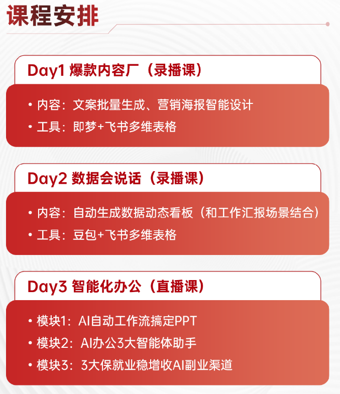 为此,秋叶团队全新升级了《秋叶AI 智能办公 3 天实战营》课程,我们不仅教你每个工具的核心用法,更重点教你如何用豆包、飞书、即梦、Coze 打出高效组合拳。