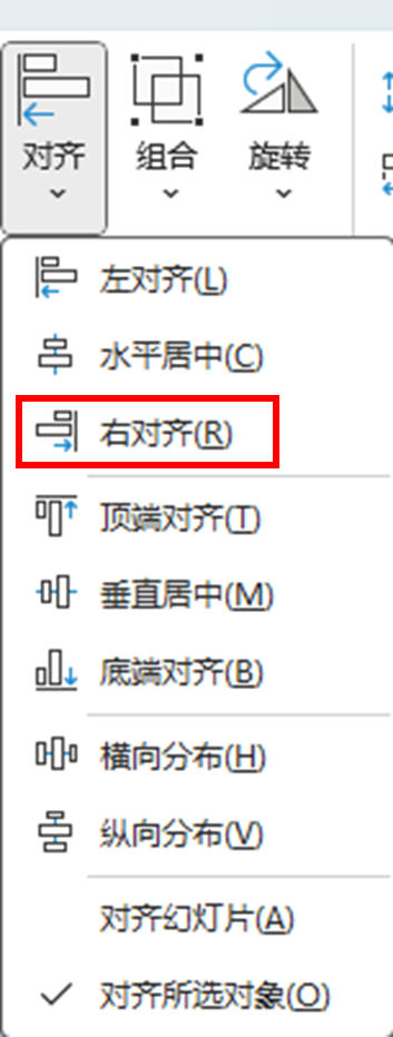 我们将这页 PPT 复制一份将,进入第一页,全选文字和形状,设置为右对齐 ↓