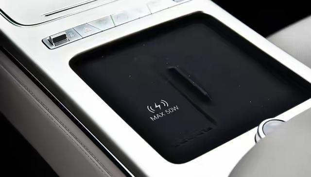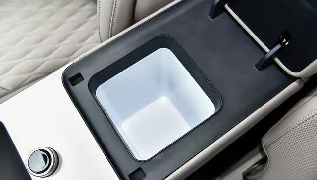 最直观的变化就是换成了电子怀挡。别小看这个改动,它直接解放了中控台下方的空间。现在这里变成了一个功能岛:翻盖杯架、50W无线快充,甚至还有冰箱!